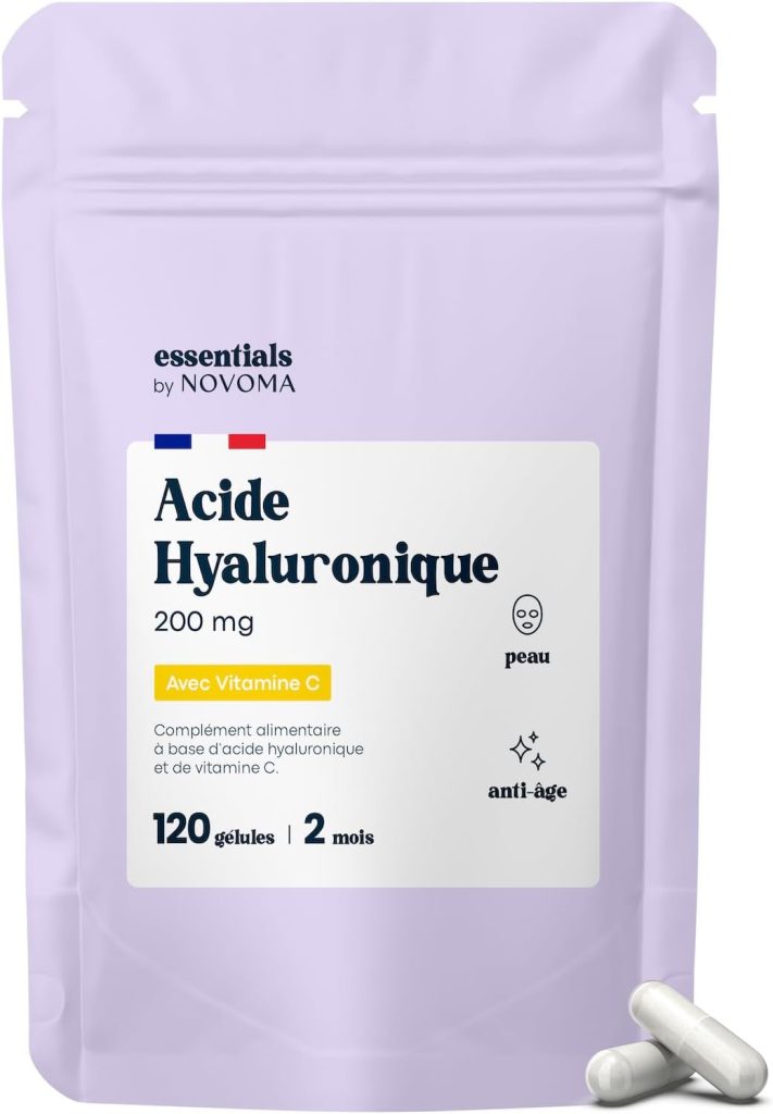 Acide Hyaluronique Pur, 120 Gélules Vegan, Action Anti-Âge + Anti-Rides, 800-900 kDa, Cure de 2 mois, Hydratation de la Peau, Avec Vitamine C, Fabriqué en France, Essentials by NOVOMA – Le détail qui change tout au quotidien
