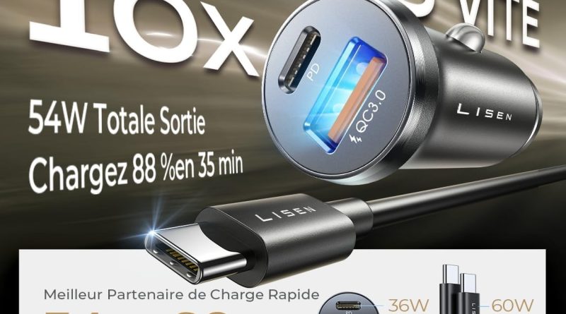 AccessoiresAccessoires pour ordinateur portableChargeurs allumes cigaresChargeurs allumes cigares,InformatiqueChargeurs et stations de chargeInformatique LISEN Chargeur Voiture USB C 54W+60W C-C Câble, Charger Allume Cigare USB C Rapide, Prise Allume Cigare 12V, Accessoire Voiture Idéal avec iPhone Air 17 Pro Max 16 Galaxy S25 Ordinateur Portable – Le détail qui change tout au quotidien