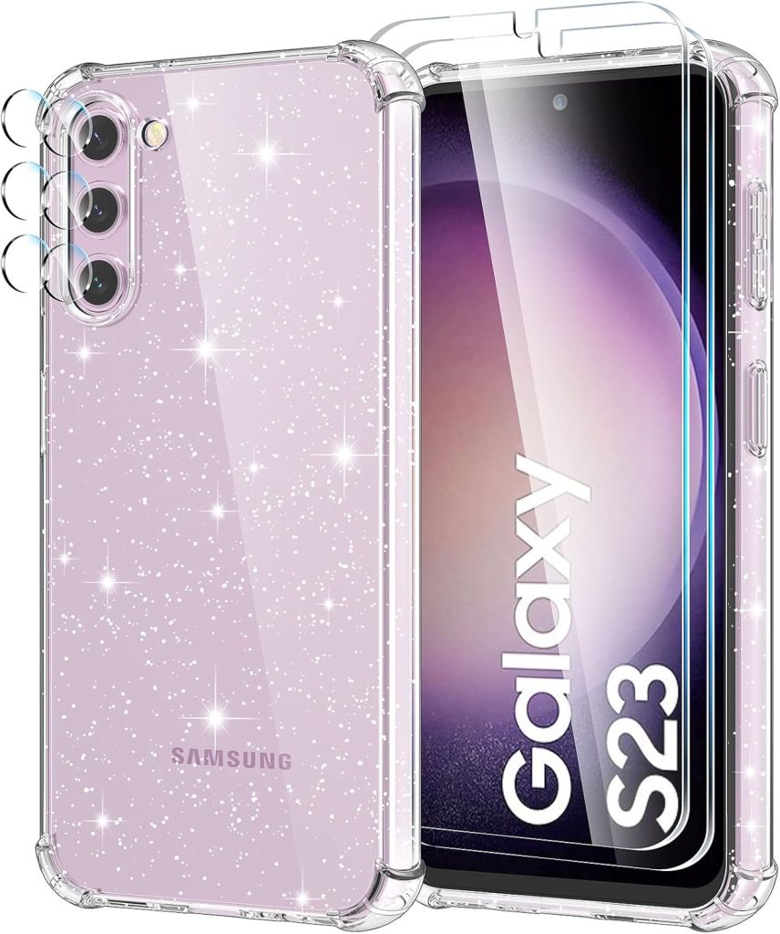 Coque pour Samsung Galaxy S23 Paillettes, avec 2 Pièces Verre Trempé Protection écran et 2 Pièces Caméra Arrière Protecteur, Transparent Glitter Etui Silicone TPU Bumper Antichoc Housse – Le détail qui change tout au quotidien