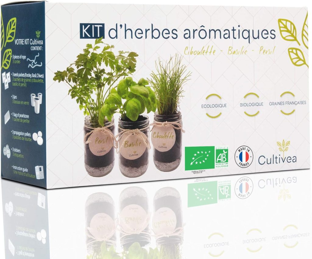 CULTIVEA® Kit Prêt à Pousser d’Herbes Aromatiques – Graines 100% Bio – Made In France – Jardin potager d’intérieur – Plante (Basilic, Persil et Ciboulette) – Idée Cadeau – Le détail qui change tout au quotidien