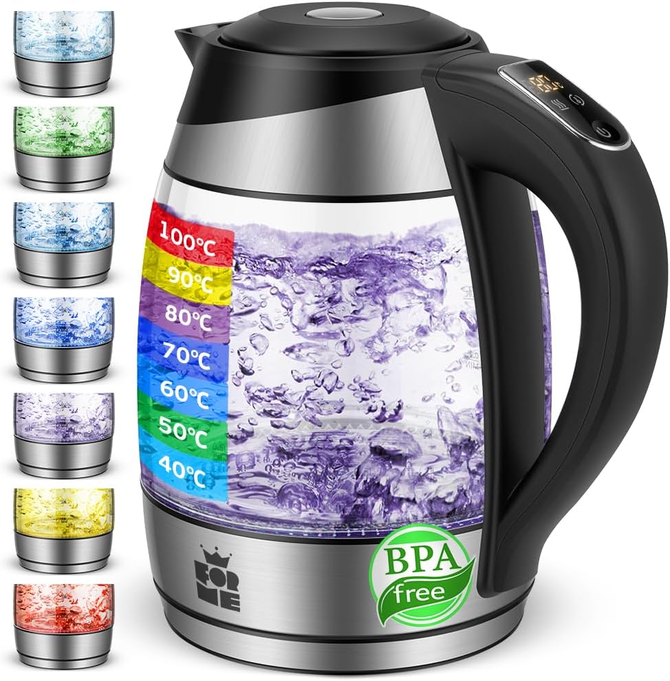 FOR ME Bouilloire Électrique en Verre 1.8L, Contrôle de la Température, Température Réglable à Partir de 40°C à 100°C, Éclairage LED 7 Couleurs, Fonction de Maintien au Chaud, Sans BPA – Le détail qui change tout au quotidien