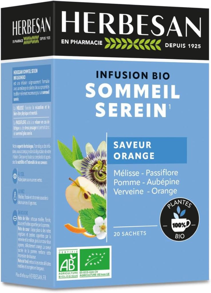 HERBESAN®- INFUSION SOMMEIL SEREIN BIO – Saveur Orange – Doux & Rond – Sans plastique – 100% plantes – 20 sachets en papier – Le détail qui change tout au quotidien