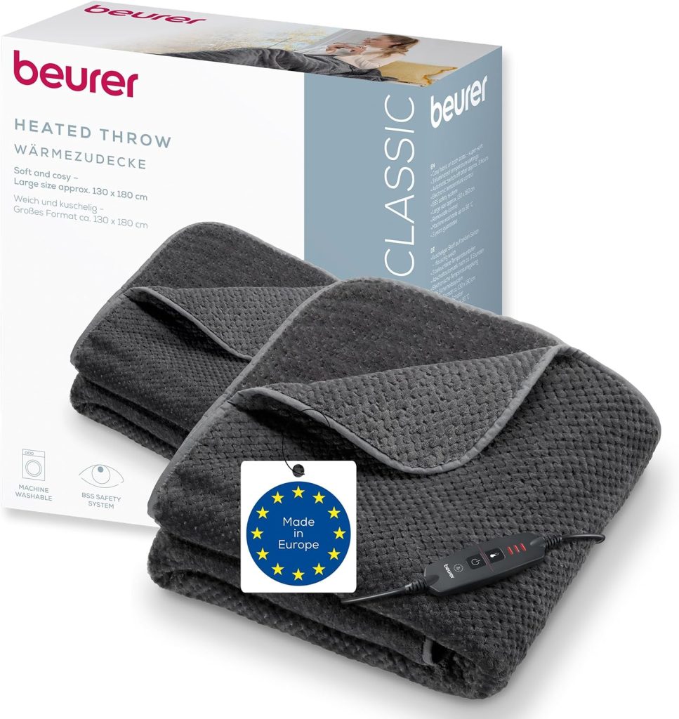 Beurer HD 65 Couverture chauffante, Couverture chauffante Douillette avec 3 Niveaux de température, avec arrêt Automatique et système de sécurité, Lavable en Machine à 30 °C, Made en Europe, Gris – Le détail qui change tout au quotidien