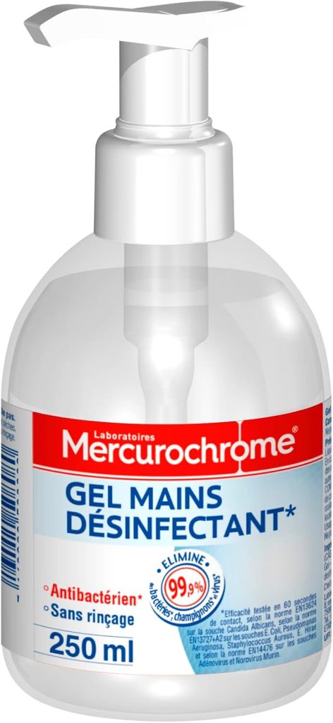 MERCUROCHROME – Gel Mains Désinfectant Hydroalcoolique – Antibactérien – Sans rinçage – Ne colle pas – Sèche Rapidement – Flacon pompe – Format Familial 250 mL – Fabriqué en France – Le détail qui change tout au quotidien