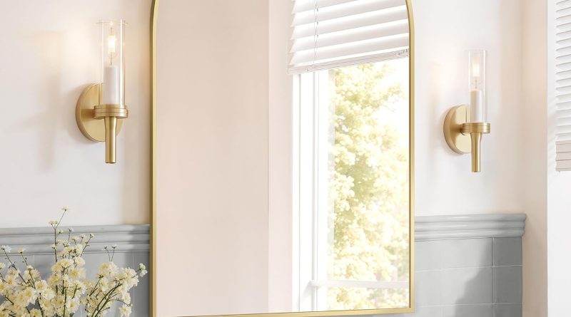 Ameublement et décorationCuisine et MaisonDécoration de la maisonMiroirsMiroirs murauxMiroirs muraux,Cuisine et Maison SONGMICS Miroir Salle de Bain, Miroir Mural Arqué, Cadre en Aluminium, 91 x 61 cm, avec Film de Sécurité, Montage Facile, pour Salon, Chambre, Salle de Bain, Doré Clair LWM011AB01 – Le détail qui change tout au quotidien