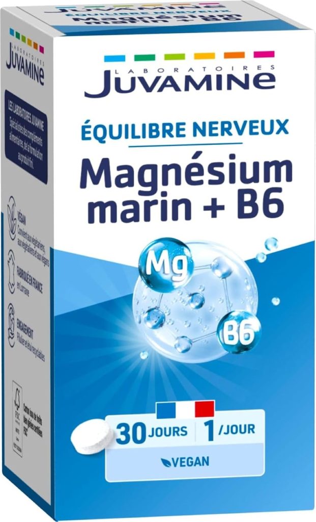 JUVAMINE – Equilibre Nerveux – Magnésium Marin 300mg + Vitamine B6 – Contribue à Réduire la Fatigue et au Fonctionnement Normal du Système Nerveux – Stress -30 Comprimés – 1 Mois de Programme – Le détail qui change tout au quotidien