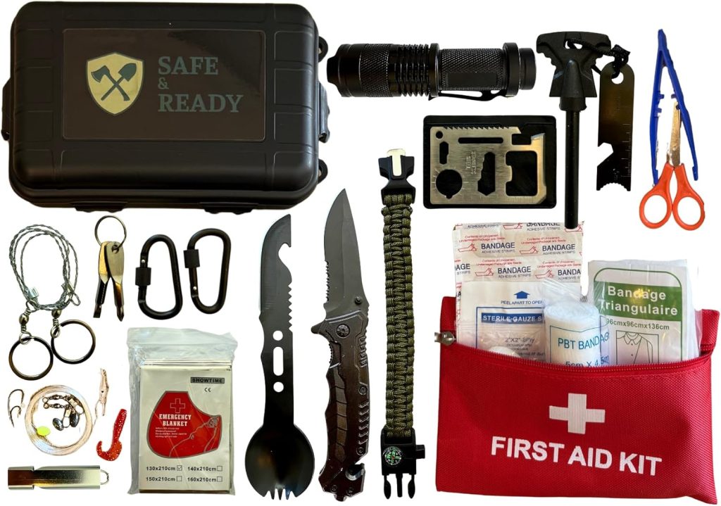 Kit de Survie 40-en-1| Étui Rigide Premium avec Couteau Tactique, Lampe Torche LED, Allume-feu, kit Premiers Secours – Randonnée, Camping, bushcraft, Urgence – Safe&Ready – Le détail qui change tout au quotidien