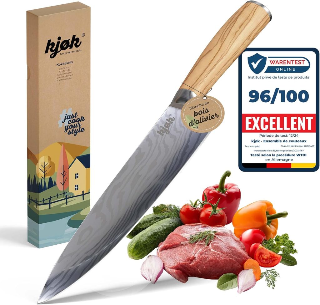 kjøk Premium Couteau de chef professionnel 20cm dureté 58±2 HRC avec etui et manche en bois d’olivier – couteau de cuisine japonaise ultra tranchant haute qualité 20 cm pour chefs et cuisiniers – Le détail qui change tout au quotidien