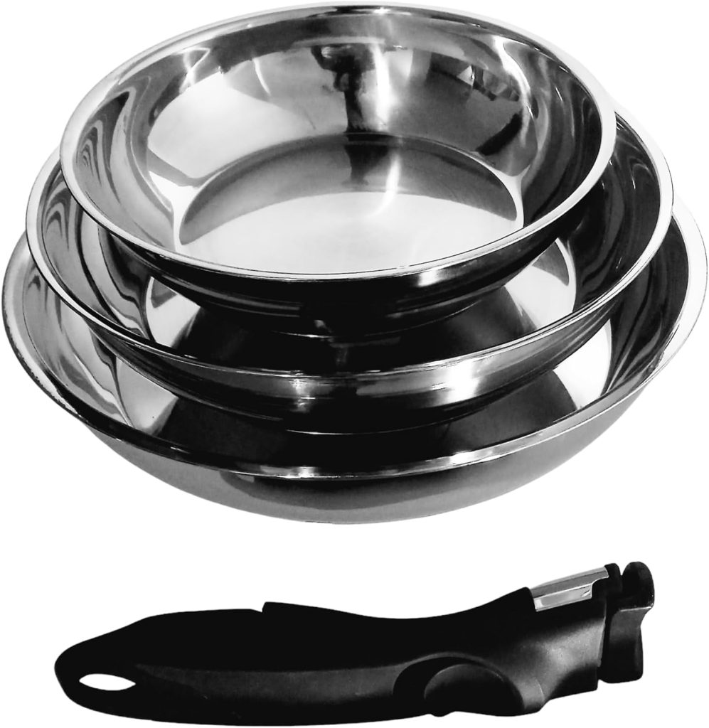 KLAUS Set de 3 poêles en inox haute qualité – Induction & four, Poignée amovible, Cuisson saine – 20/24/28 cm – Le détail qui change tout au quotidien