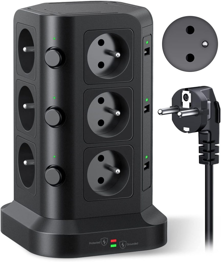 KOOSLA 12 Prises 2P+T de Type-E (France) Tour Multiprise avec 6 Ports USB(4000W/16A), Multiprise Electrique parafoudre et surtension, 3 Interrupteur Individuel, 2M Cordon, Noir – Le détail qui change tout au quotidien