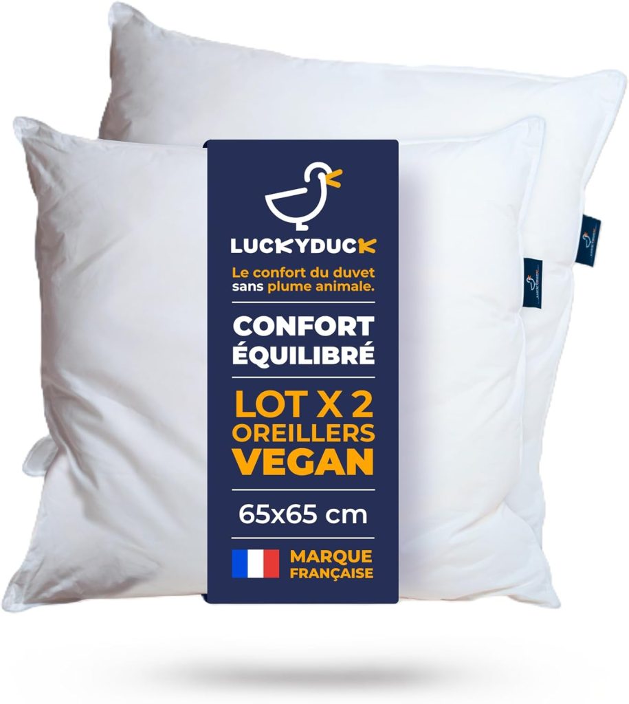 LUCKY DUCK Lot 2 Oreillers 65×65 – Garnissage Microfibre – Percale Coton Blanche – Confort Durable et Respirant – Grand Format 65×65 – Lavables en Machine – Le détail qui change tout au quotidien