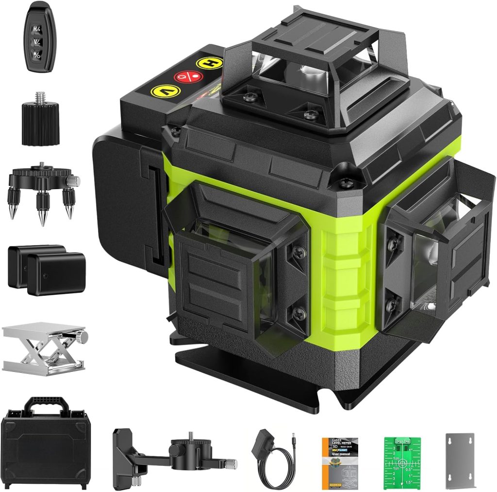 Niveau Laser Chantier Autonivelant 360° x 4, Lazer Niveaux 4D 16 Lignes Laser, Autonivellement et Mode Pulsé Extérieur, 2 x Batterie, Nivellement Automatique, Support Rotatif, Télécommande – Le détail qui change tout au quotidien
