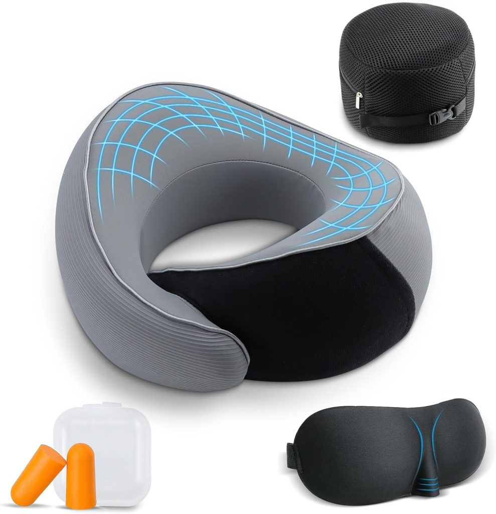 Oreiller de Voyage en Mousse à Mémoire de Forme, Coussin de Voyage Oreiller Cervical Oreiller d’avion, Coussin Avion Coussin Ergonomique avec Masque pour Les Yeux et Bouchons d’Oreille (Gris) – Le détail qui change tout au quotidien