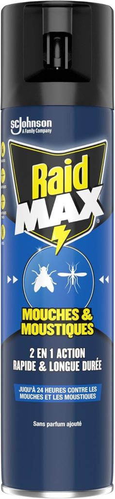 Raid Max Aérosol Mouches et Moustiques – 2 en 1 Action Rapide et Longue Durée – Sans Parfum Ajouté – 1 Aérosol – Le détail qui change tout au quotidien