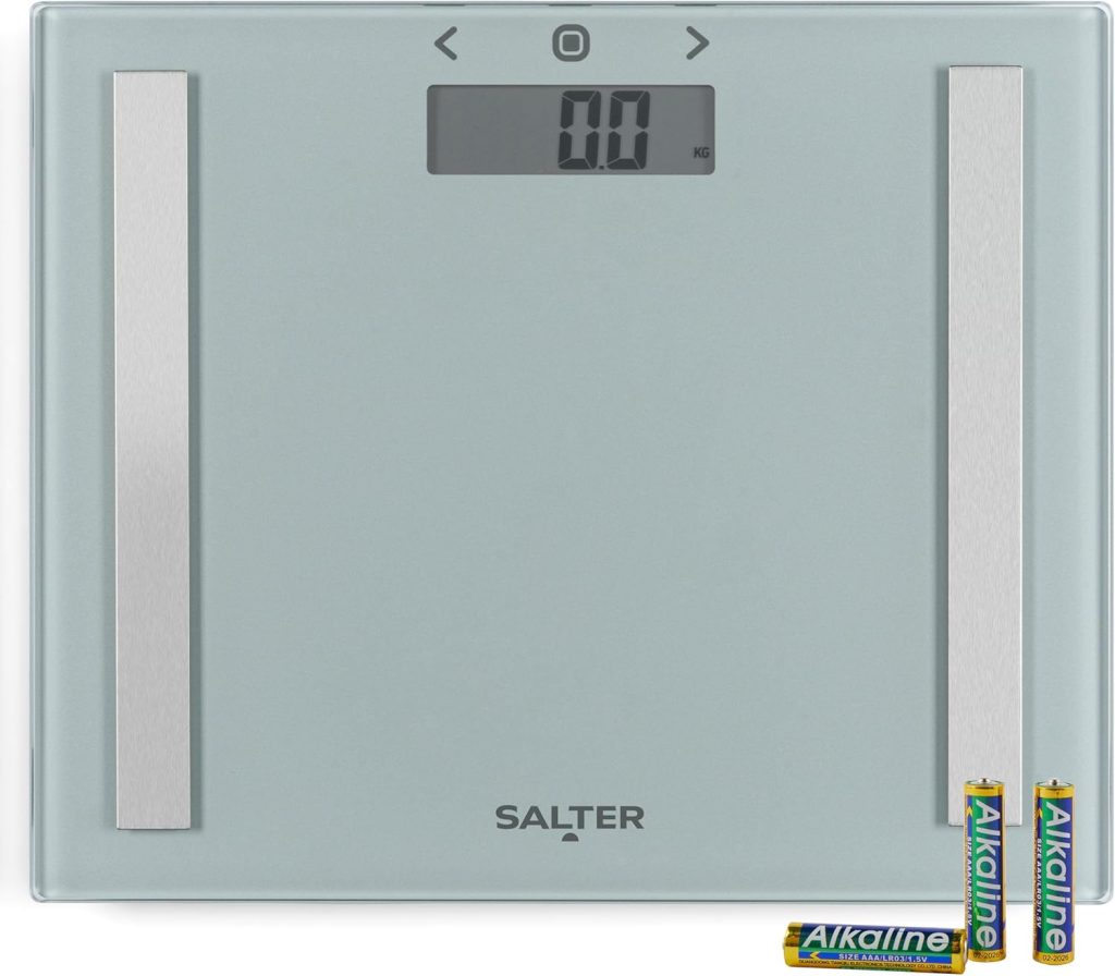 Salter Pèse-Personne Impédancemètre Analyseur – Balance Numérique en Verre, Mesure Poids, Graisse Corporelle, Eau et IMC, Mode Athlète, Capacité 150 kg, Écran Facile à Lire, Argent – Le détail qui change tout au quotidien