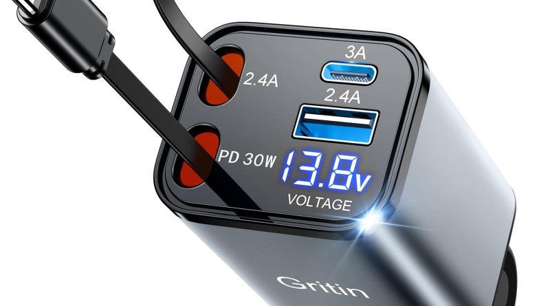 Accessoires téléphones portablesChargeursChargeurs pour automobileChargeurs pour automobile,High-TechHigh-TechTéléphones portables et accessoires Gritin 4 en 1 Rétractable Chargeur Allume Cigare Voiture USB C 69W, PD 3.0 Charge Rapide Chargeur Voiture avec USB-C/USB-A, Prise Ajustable, Voyage Car Accesoire pour iPhone 17/16/15/14/Galaxy/Android – Le détail qui change tout au quotidien