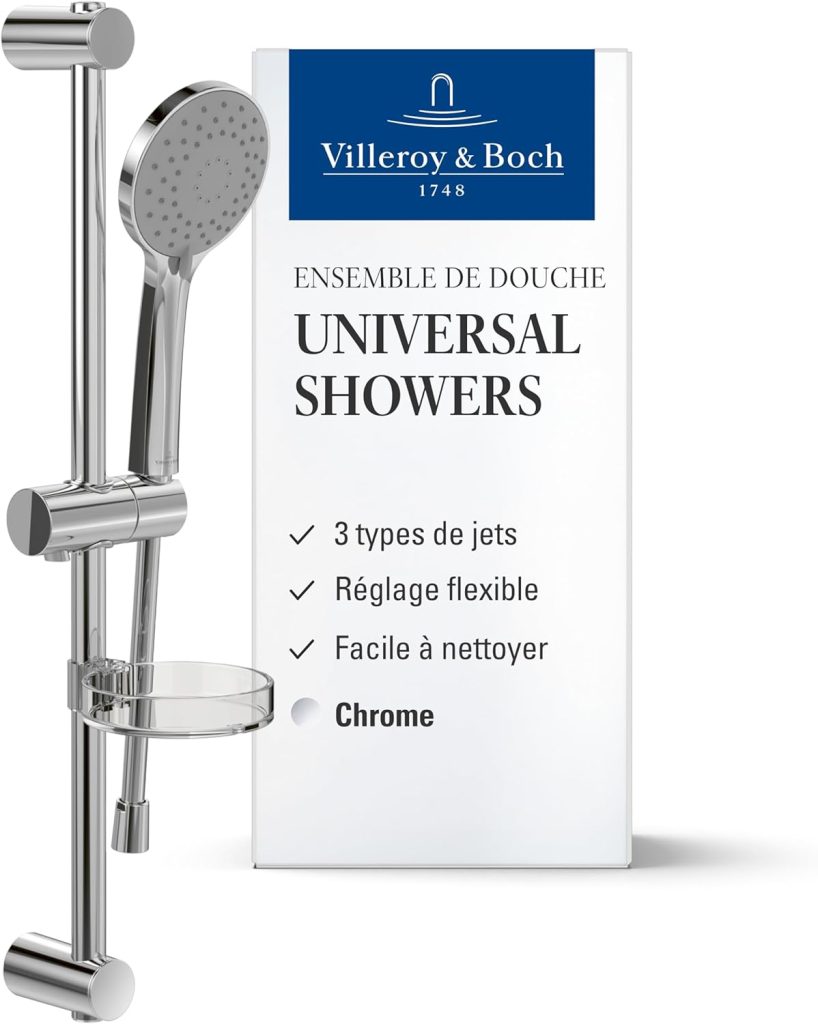Villeroy & Boch Verve Showers système de doucher – Barre de douche et douchette à main 3 types de jets – Support de douchette à main – Anti-calcaire – Système de douche facile à monter – Chrome – Le détail qui change tout au quotidien